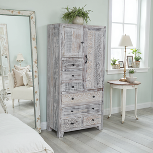 A beautiful, large armoire with drawers serves as an excellent middle point in the bedroom. To best match your décor, pick styles with glossy hardwood doors, appliqué mirrors, smooth metal handles, and a variety of additional alternatives. With this large armoire having many doors & drawers, you can keep your bedroom organized while adding a traditional rustic vibe to the interior design of your home. And go no further than our collection of premium armoires for complete storage solutions. This masterpiece is expertly handmade by artists, adding an ethnic touch. This wardrobe/armoire has a lot of storage capacity thanks to its seven drawers and two doors. One large door, one large drawer, and one little drawer all display hand carving. This large rustic chest is whitewashed and has a distressed appearance, which adds to its allure. This armoire with drawers has simple textures, which draw inspiration from nature, and give off an unpretentious warmth. Some earthy rustic colors in a white finish complement the carved details. This one-of-a-kind piece of rustic charm will fit in seamlessly with the decor of your living room or bedroom, whether modern, traditional, or vintage. This rustic armoire is special since no two parts are the same. Each component exists independently of the others.