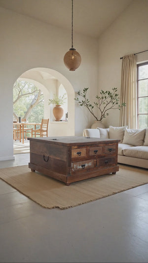 Handcrafted in solid mango wood this 5-Drawers Trunk Coffee table is a unique piece of furniture which brings a rustic charm to any living area. This square shape coffee table has one door opening upwards providing ample space to keep the things and it also features with 5 pull-open storage drawers. Use it as a coffee table, a bedroom dresser, a fun place to store games ... the possibilities are endless. Made from solid, reclaimed wood and finished to a smooth finish, this trunk will be a unique addition to your home. The black hinges and handles are made of sturdy metal for durability. The uniqueness of this coffee table is that no two pieces are the same. Every piece is an individual piece in itself.